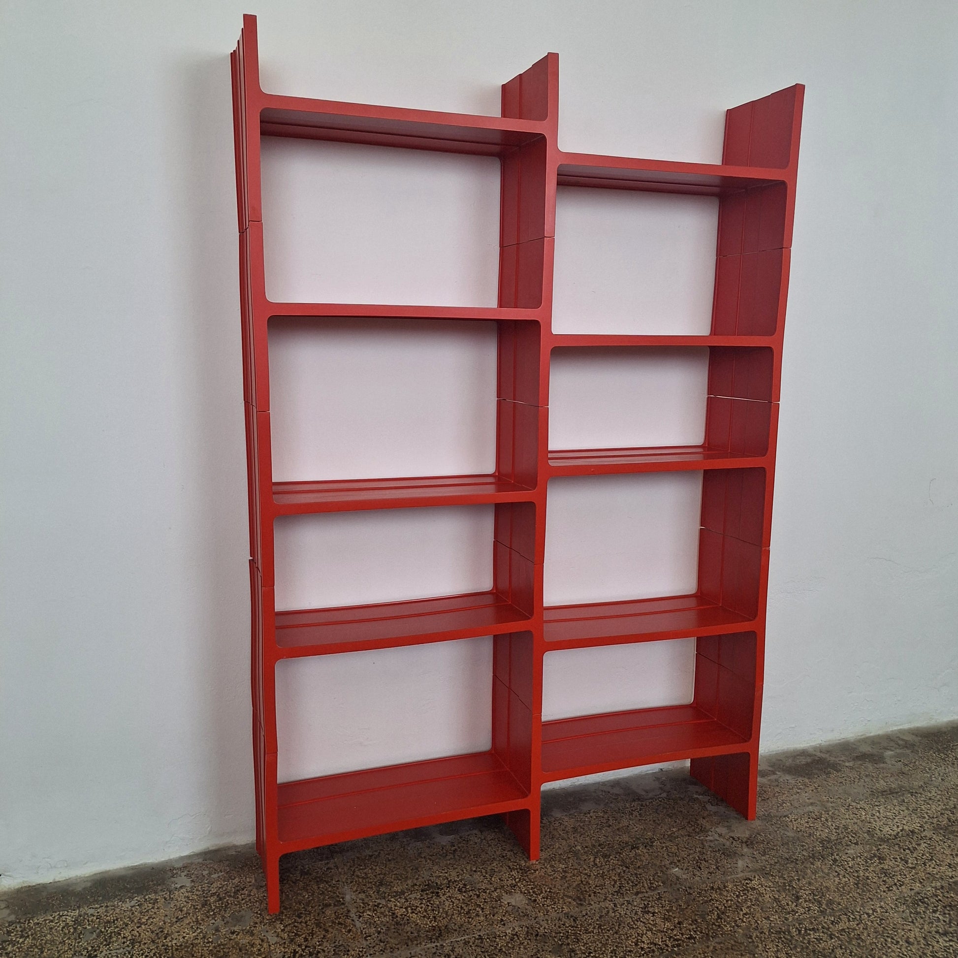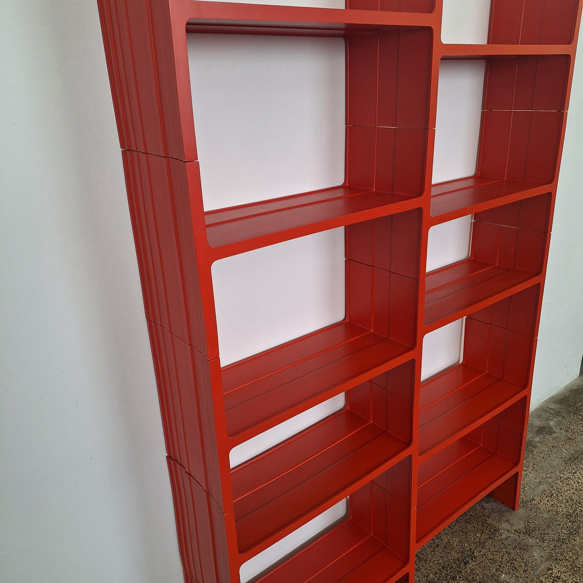 Rara libreria anni '70 in materiale plastico arancione. Composta da un sistema di 5 scaffali modulabili.