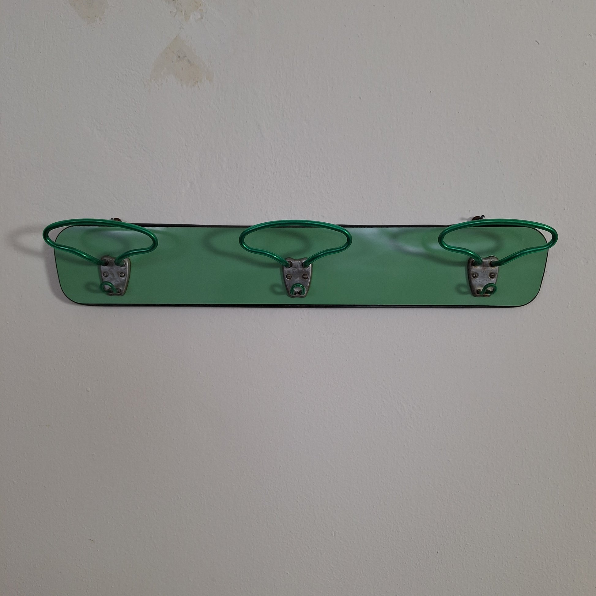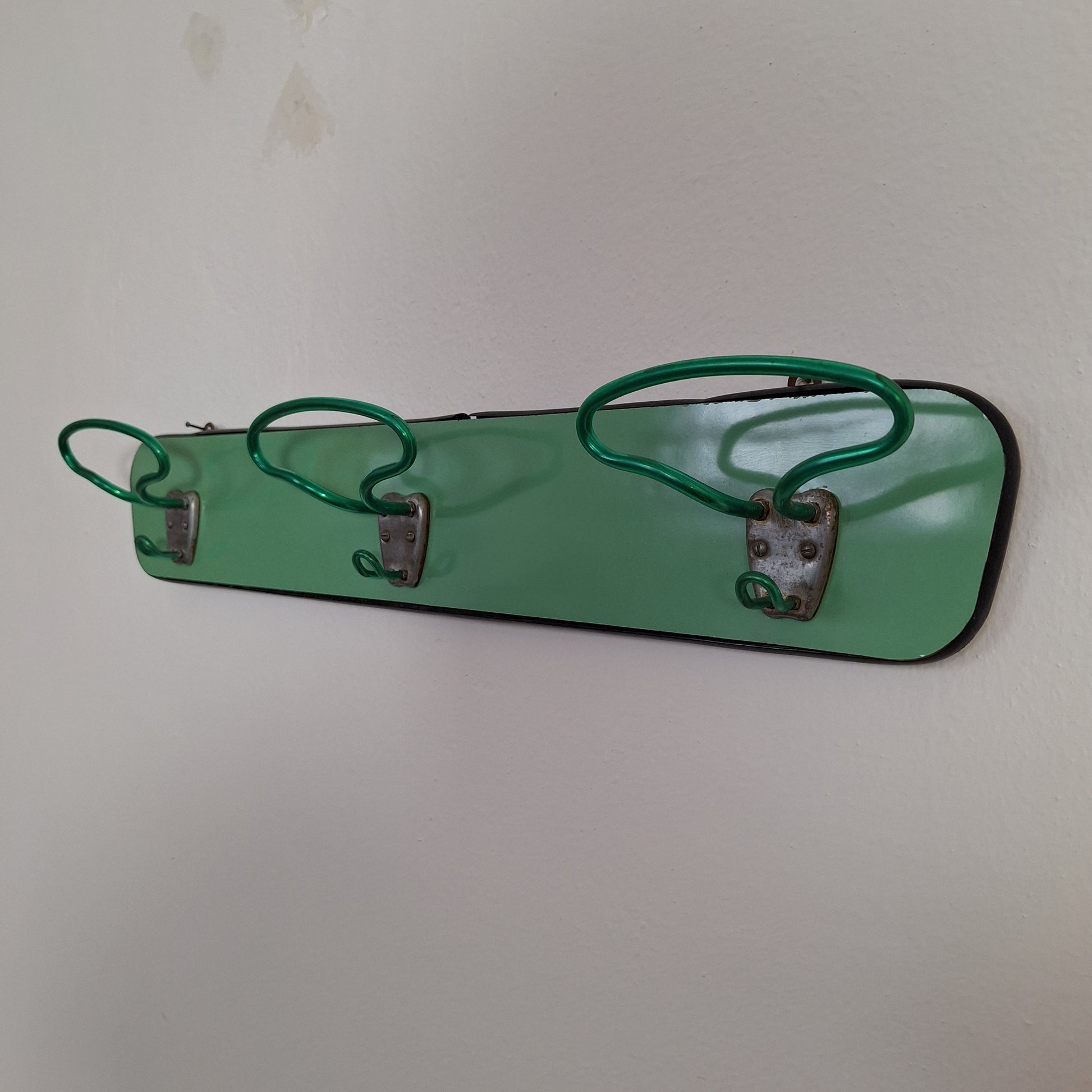 Appendiabiti da parete in formica verde realizzato in Italia neglia nni '60. E' composto da 3 ganci. Completamente ripulito si presenta in ottime condizioni generali.
