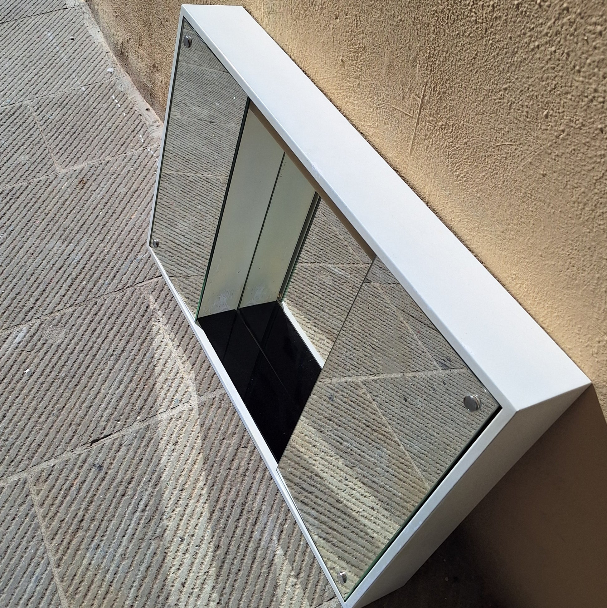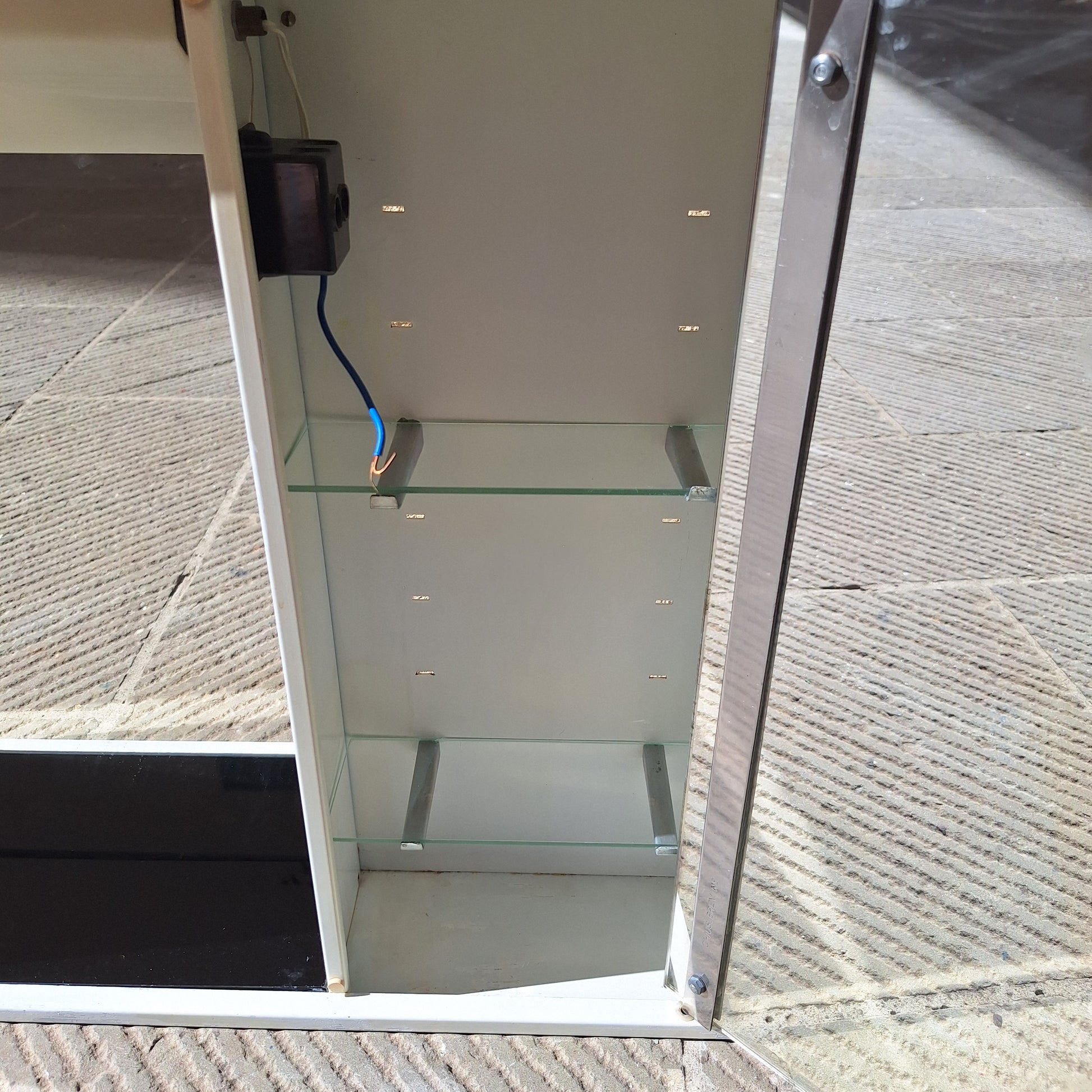 Composto da due armadietti, una mensola in vetro nero e una lampada. Gli armadi sono entrambi dotati di due mensoline in vetro. Predisposto per essere attaccato al muro.