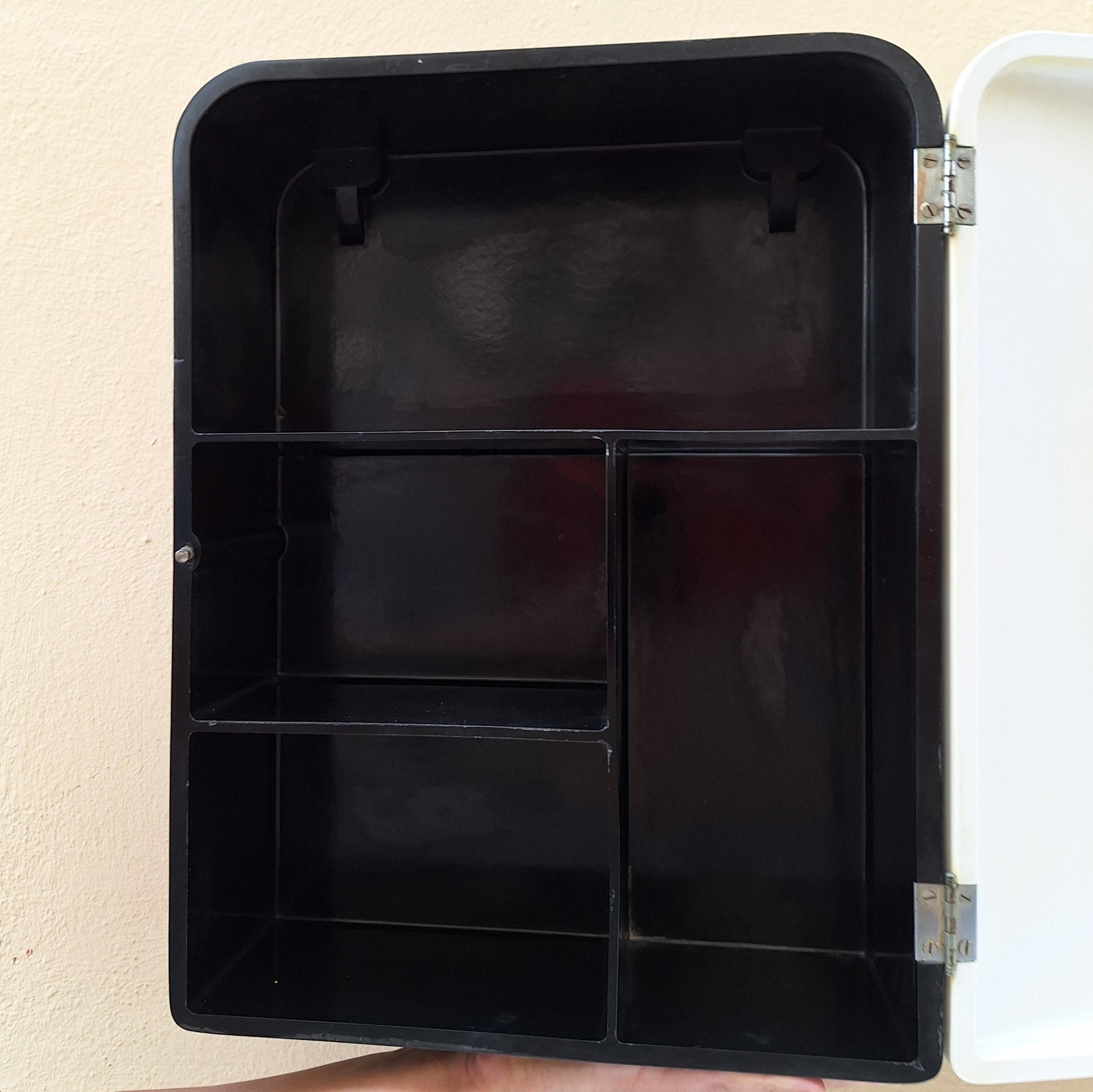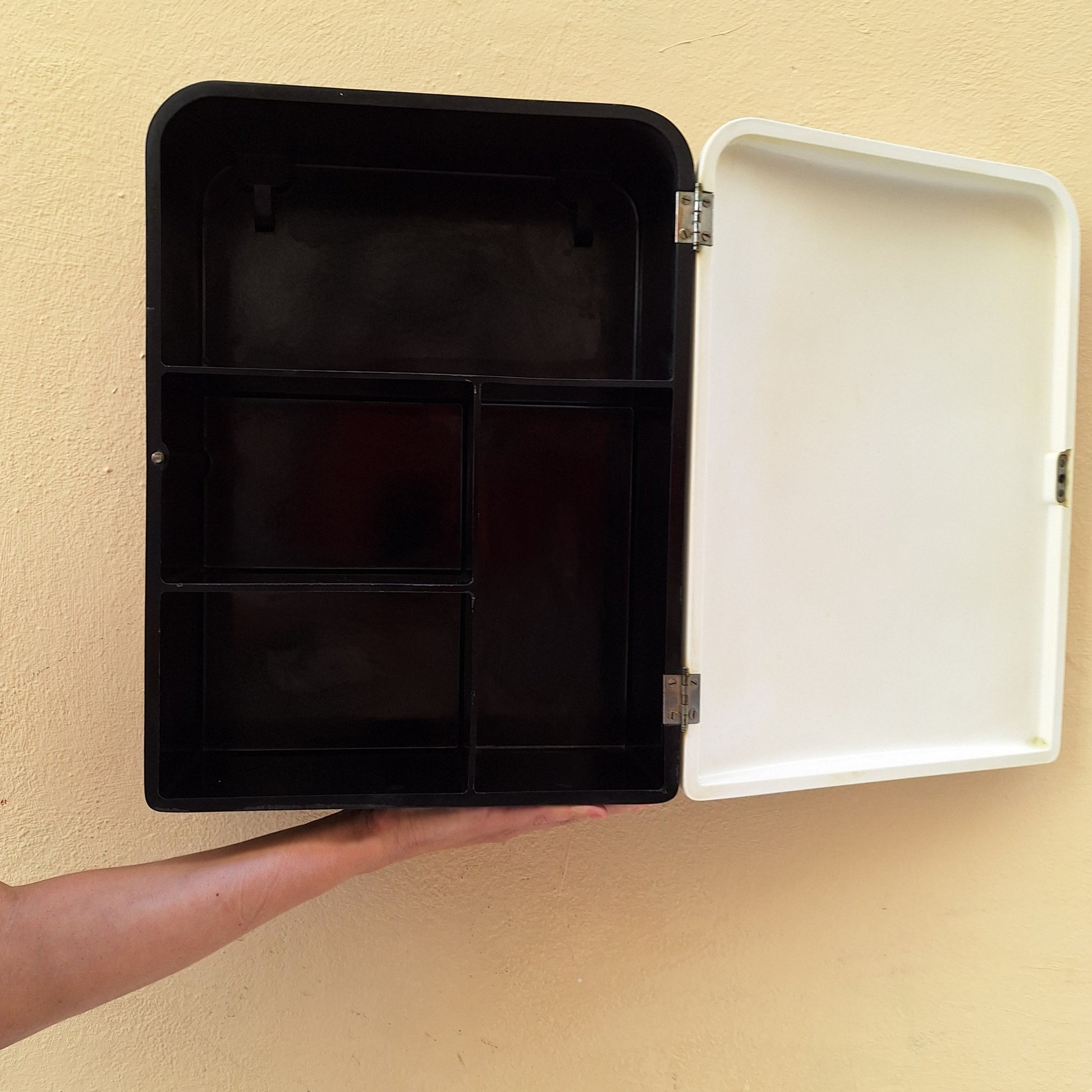 Armadietto a muro per i medicinali prodotto in Italia negli anni '50. Realizzato in bachelite bianca e nera.