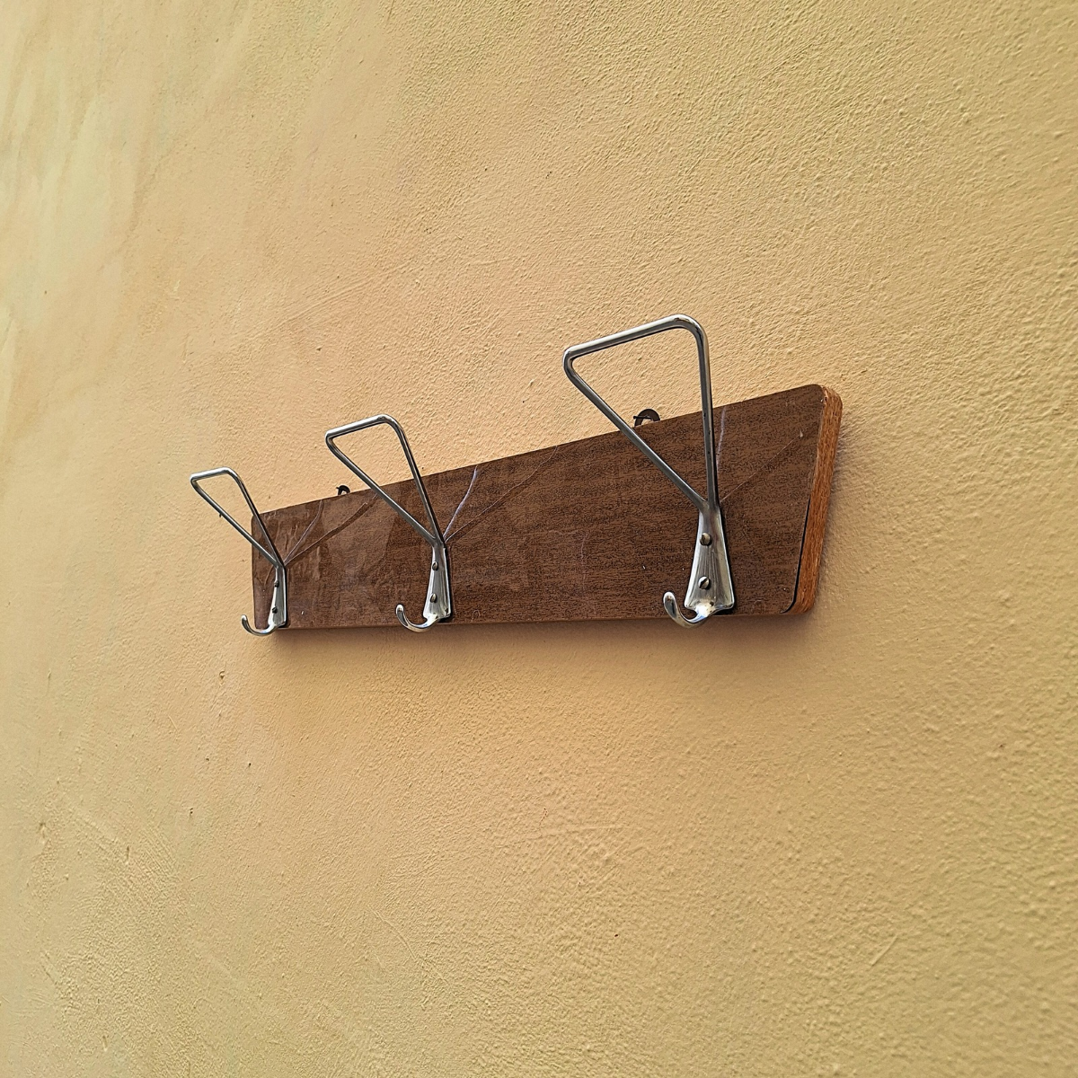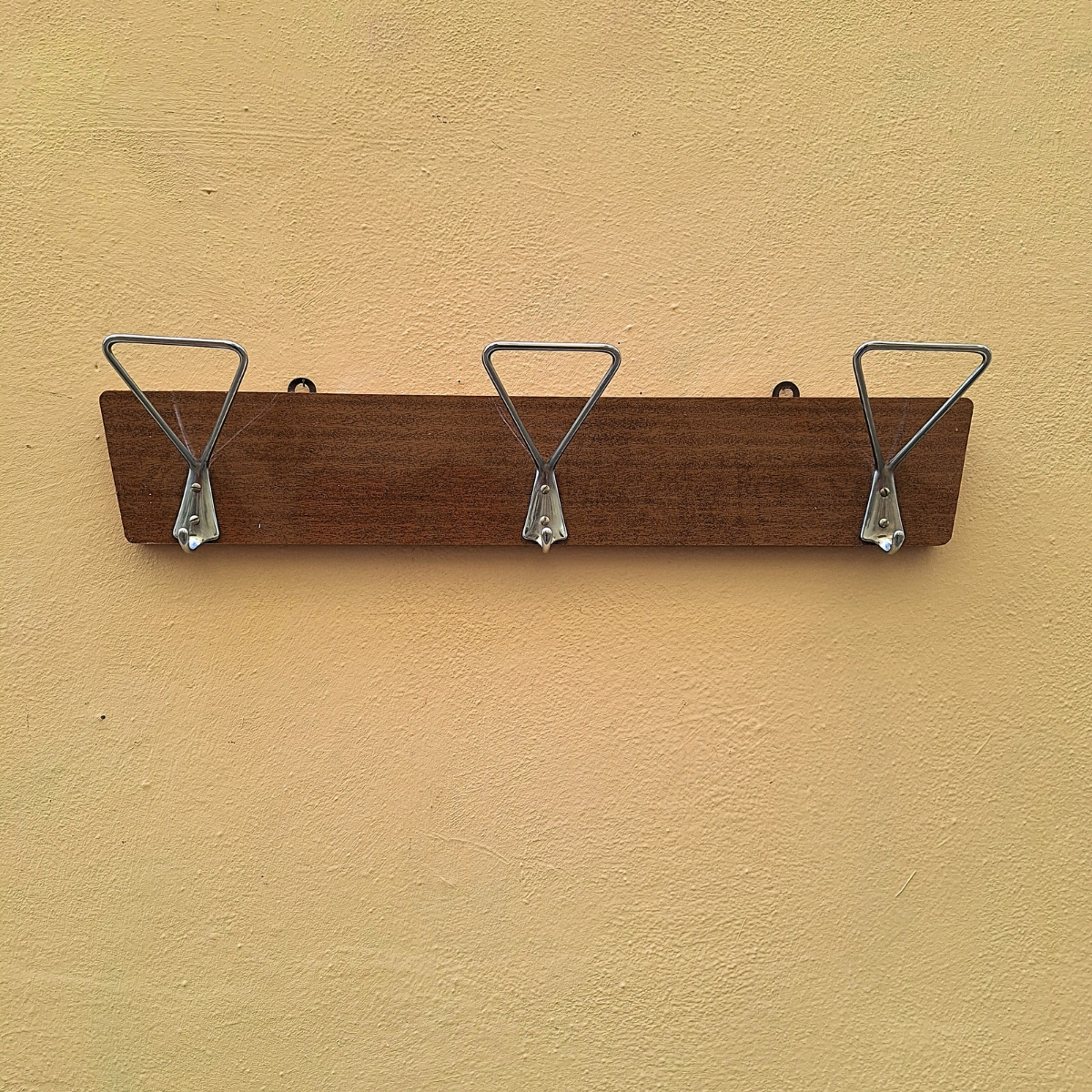 Attaccapanni anni '70 in formica, completo di 3 ganci appendiabiti e 2 ganci posteriori per fissarlo al muro. Si presenta in ottime condizioni.