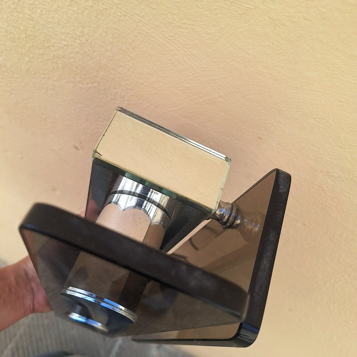 2 Lampade appliques da parete anni '60 attribuite a Veca Fontana Arte. Supporto in acciaio cromato per 3 lastre in vetro fumé. 2 lampade contrapposte. Si presentano in perfette condizioni. Della stessa serie disponibili anche lo specchio e un lampadario.