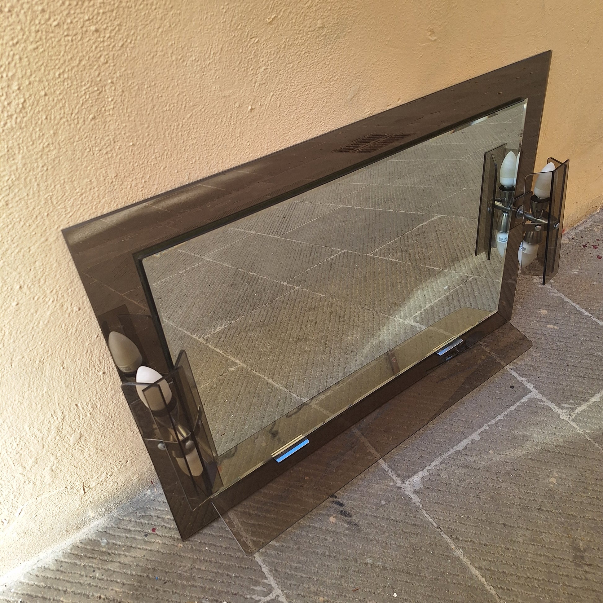 Specchio rettangolare con bordatura in vetro fumé anni '70. Attribuibile a Veca Fontana Arte. Con appliques laterali e mensola. Si presenta in ottime condizioni con due lievi sbeccature del vetro (vedi foto).